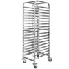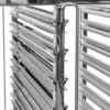 Stainless steel trolley for trays for professional use in catering establishments. It easily accommodates 30 pallets with a maximum load of up to 150 kg. The open design of the trolley ensures easy access to the pallets being transported.