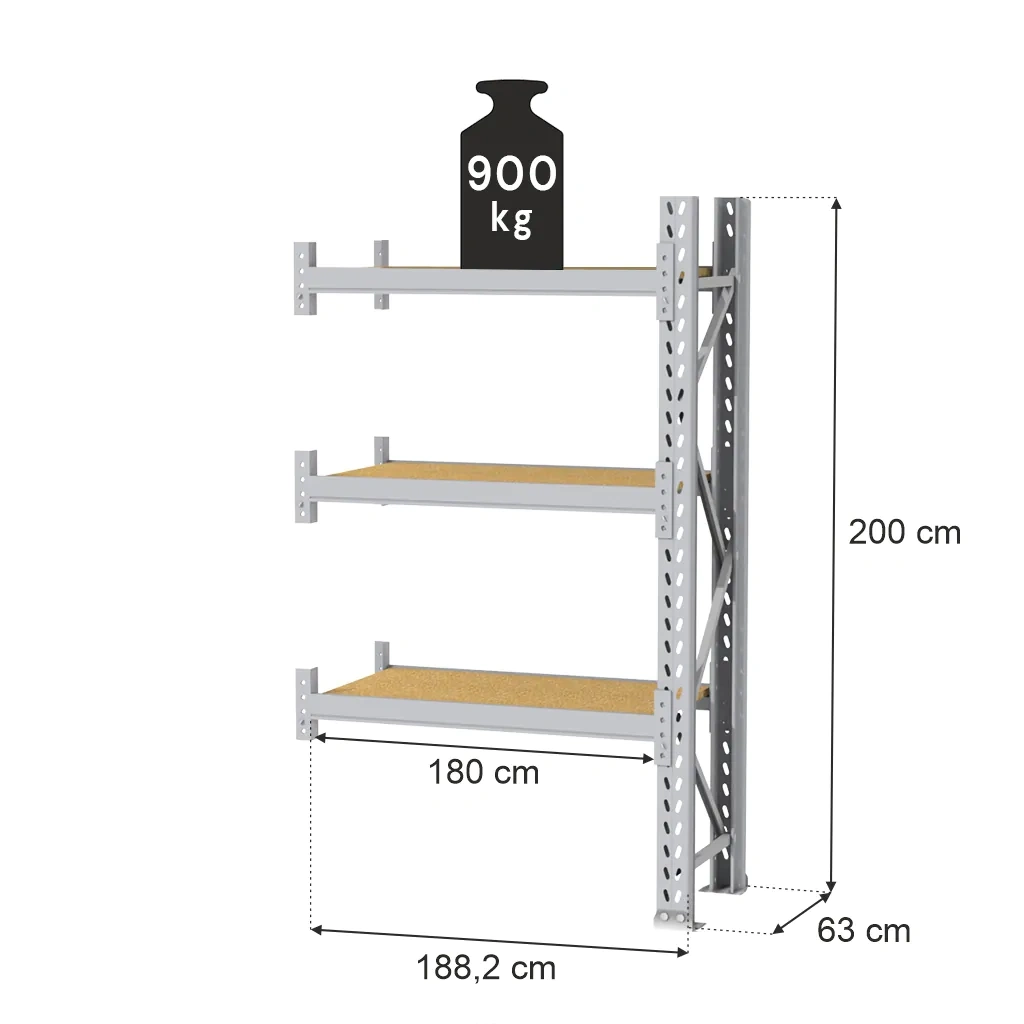 MAGO HX additional module, 200 cm high, 188 cm long, 75 cm deep, shelf dimensions: 180 × 63 cm. Maximum load of 1 shelf 900 kg with even load distribution.