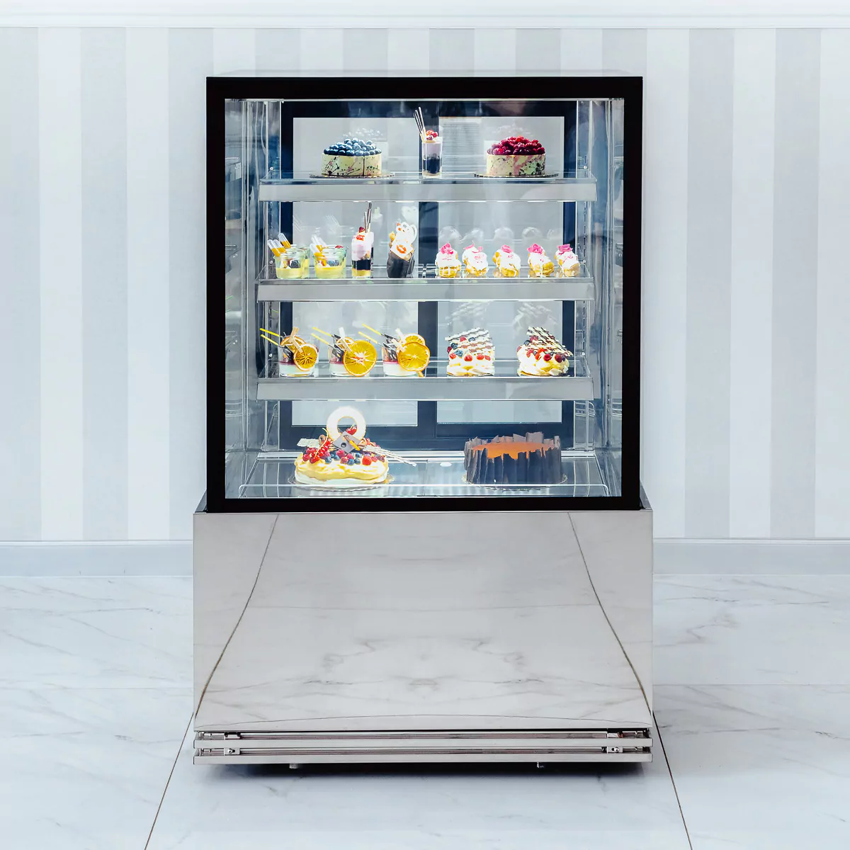 Profesionali konditerinė vitrina su dinamine aušinimo sistema , lenktu stiklu ir LED apšvietimu skirtas pritraukti klientų dėmesį.