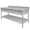 Mega-M maitinimo stalas su lentyna ir stalčiais pagamintas iš nerūdijančio plieno, atsparus mechaniniams pažeidimams ir korozijai. Stale yra 3 estetiški ir funkcionalūs stalčiai bei lentyna apatinėje dalyje. Jo reguliuojamos kojelės leidžia pritaikykite stalą prie nelygių grindų virtuvėje ar parduotuvėje. Šie nerūdijančio plieno baldai puikiai tinka restoranams, barams ir kitoms maitinimo įstaigoms, taip pat kepyklėlėms, ir bakalėjos parduotuvėms. Papildomas maitinimo stalo privalumas – 10 centimetrų kraštas saugantis užpakalinę sieną stalą nuo purvo.