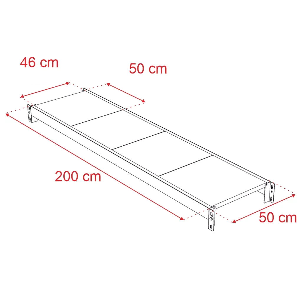 Sandėliavimo lentyna lentyna FORTIS LIGHT , aukštis 240 cm, ilgis 217 cm , gylis 50 cm. Lentynų išmatavimai 200×50 cm. Maksimali apkrova vienoje lentynoje 350 kg tolygiai paskirstant apkrovą.